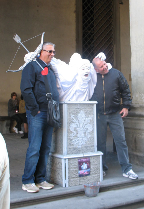 Our mission for Day 2 of Florence was to conquer the Uffizi, a mammoth art museum that houses thousands of famous artworks. It was mind-boggling – halls the length of football fields and what seemed like hundreds of connecting rooms. There was so much to see that we needed to take a coffee break in the middle of our visit. The Uffizi has a great rooftop café and terrace. The sparrows there are very aggressive. I was holding a sandwich in one hand and turned my attention to my coffee cup and this sparrow fly right up snatched a tiny bite of my sandwich. Amy yelled out, otherwise I might not have noticed at all. These would never be so bold when you were looking right at them. They lined up on the ground – waiting till you looked away – smart birds!