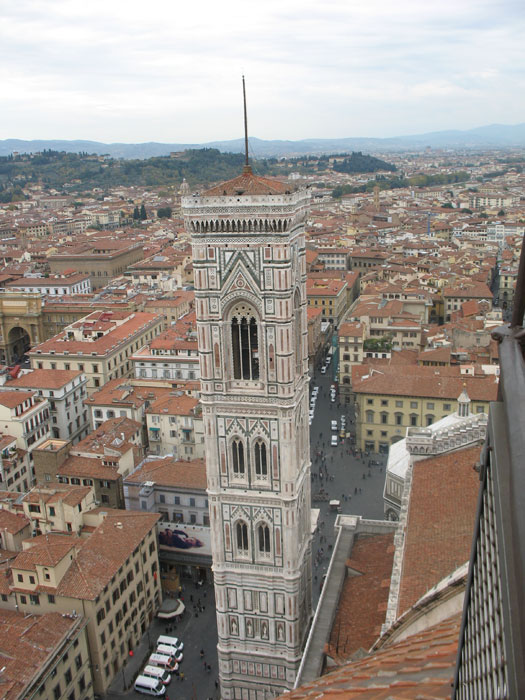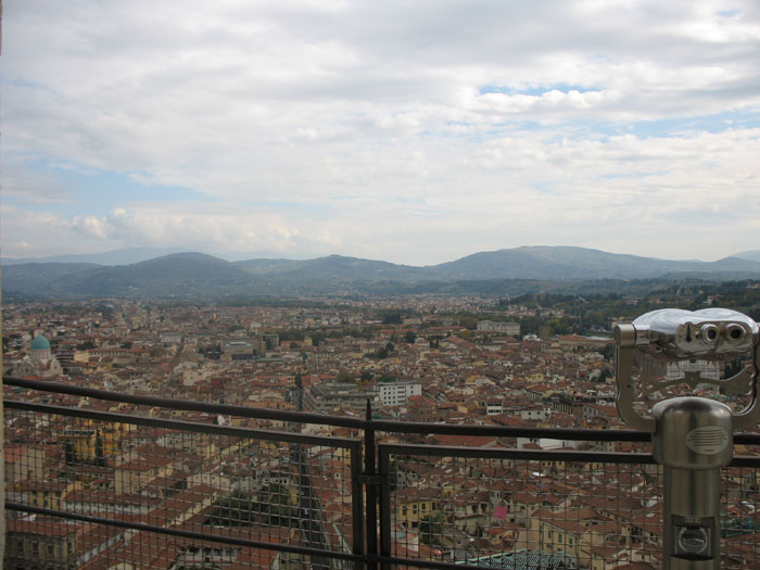 There was light at the top of the stairway but the descending tourists had taken control of the thoroughfare. It seemed like they would never stop coming. This observation deck must be huge, I was thinking to myself, and why this mass exodus right when we are only ten steps from our goal? Is there some guy up there in a trench coat exposing himself? Actually, I didn’t think of that possibility then, I just thought of that now, but wouldn’t it have been great if I had thought of it then? I could have started screaming hysterically, “There’s a man exposing himself on the observation deck!” That would have got people out of my way! Then Amy and I could have had the entire Florence skyline to ourselves. On the downside, dozens of tourists would probably have been trampled to death in the ensuing stampede and who knows, maybe a few particularly religious individuals might have purposely thrown themselves over the railing to certain death just to avoid seeing a man’s genitals. I could be stuck in an Italian prison for the rest of my life for one childish prank! I’d wanted to spend more time in Europe but this was not exactly what I had in mind. It just goes to show you: be careful what you wish for!