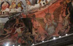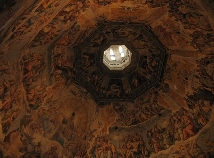 On Day Three in Florence we set out to climb the Duomo. It’s that big thing in the middle of town that looks like an enormous football half buried in a cathedral. It’s the tallest structure in Florence. An Italian architect told me that there is a law against building anything taller than the Duomo in Florence. There was a long line of tourists waiting when we got there but it moved along. Once inside the duomo climbers made their way up a narrow stone stairway what must have been the equivalent of ten stories just to get to the bottom of the dome – where it starts to curve inwards. There’s a catwalk so you can get a good look at all the painting somebody did up there – tons of angels and people praying and big red demons devouring all the unfortunate chumps who obviously didn’t pray enough! Maybe if my church growing up had had paintings of demons devouring human flesh I might have been more excited about attending.
