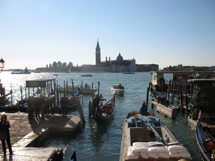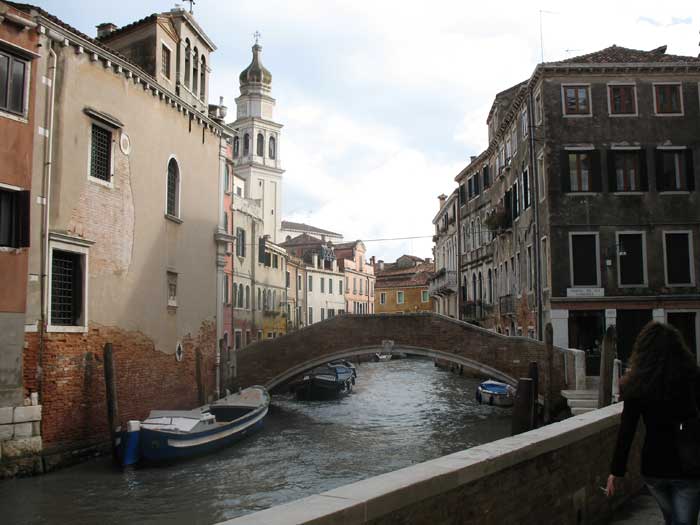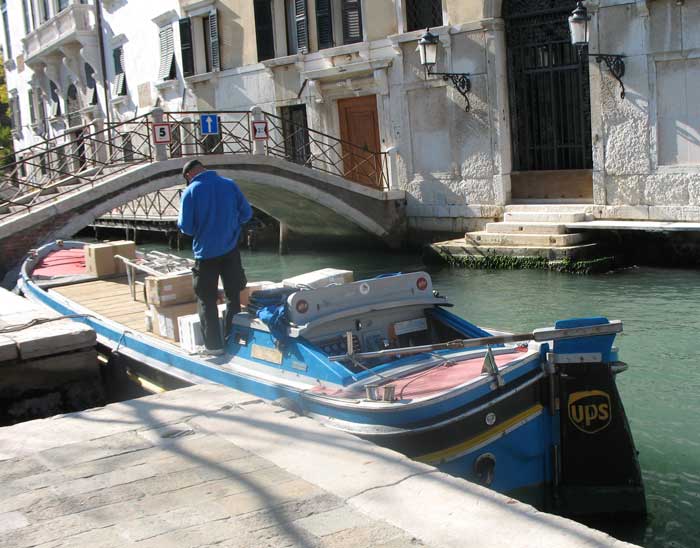 One misconception I always had about Venice was that since it had canals where most cities had streets you needed a boat to go anywhere. The reality is that most people get around by walking and traveling by boat is actually rather expensive. Most of the canals are crossed by foot bridges so it’s possible to get where you need to go on foot, provided you can navigate all the twisting, turning streets, many of which are comically narrow. Many of the streets are assembled with mismatched stones and stairways so it’s not really conducive to bike riding either. The canals do however handle most of the commercial traffic. Deliveries are made by long open boats – beer and wine and other necessities – we even saw a boat with a UPS logo on the rudder. So Venice was perfect for a leisurely stroll. If you had a specific destination it was a little more arduous – a map is indispensable. Luckily, the major destinations are often marked by yellow signs at the frequently intersecting streets. Initially, we had to meet Stefano on a bridge near the Greek Orthodox Church on the far side of San Marco Piazza – he didn’t give us a street address.