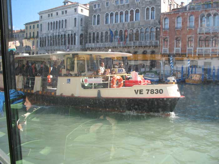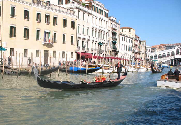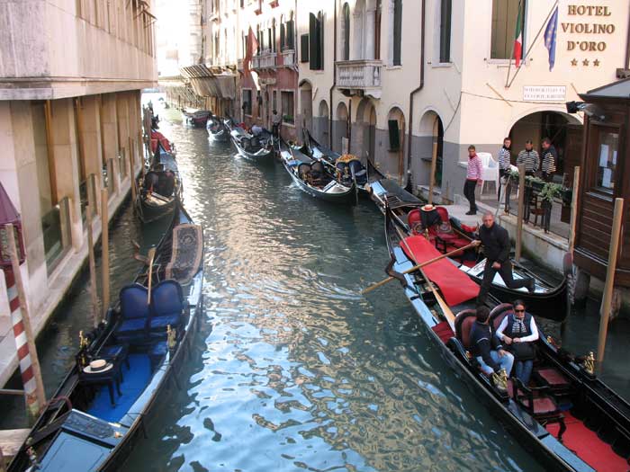Another 100 steps and this street halted and followed another sign guiding us sideways through a narrow corridor. We must have made a fifty turns along the way, following the trusty yellow signs. Suddenly the ancient yellow walls opened up and the wide steps of the Rialto bridge lay before us, swamped with picture-taking tourists, souvenir peddlers and purveyors of a variety of snacks. Down below was the Grand Canal and a steady stream of boat traffic – vaporettos – which are long passenger boats that function as the city buses, cargo-laden commercial boats, smaller water-taxis that look like converted speedboats, and those pricey gondolas (starting at 80 Euros = over $100!).