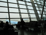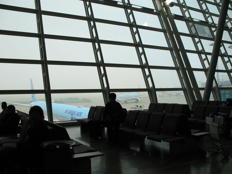 | We began our adventure on the subway to JFK Airport from the magical land of Brooklyn, New York. We had a very long flight ahead of us - fifteen hours to Seoul, South Korea, a four hour layover and then a three and a half hour flight to Hong Kong. I was dreading it already, so when I found out our seat assignments were screwed up and airport security wanted to confiscate my toothpaste and Amy's hair spray, I was not a happy camper. Miraculously, it was all resolved before we took off. | Foggy Airport |