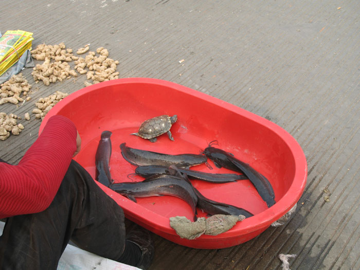 | I had to make a stop at Mister Donut first. It was the only place in town that they didn't mind me pounding my fists on the counter and screaming, "Gimme some American Coffee, dammit!!!" After a few donuts, I followed the map until I knew I wasn't in Zhongshan Park anymore. The clean modern high rises were gone except for the ones I could over the rooftops of the old crumbling buildings that lined the creek. It was like a mad scientist had transplanted the village of Xingping into the middle of the city of the future. There was a man who was pounding out woks with a hammer on the side of the road. Another was selling half eel half catfish creatures squirming around in a red plastic tub. There were many things there that I did not understand. Of course I was late getting back to the hotel. | |