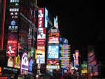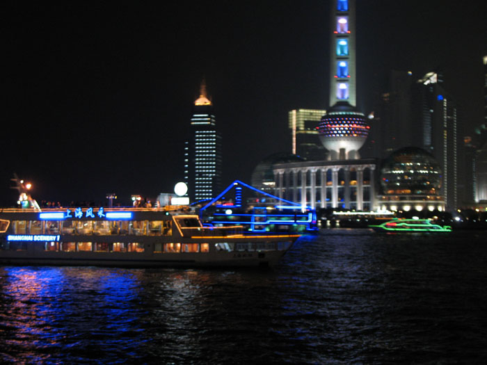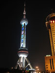 called the Bund but it's not very interesting, really. What is exciting is the Oriental Pearl Tower - proof that aliens have landed on this planet. The first time I saw a photo of it years ago, I knew I wanted to go to Shanghai. Just goes to show you what a science fiction nerd I am at heart. It's even better to see in person because it has tracer lights spinning all around it and it's constantly changing colors. Dude! It will melt your brain! Seriously, dude! The whole Pudong skyline is pretty darn amazing. Maybe they could have come up with a better name than Pudong, but anyways... even the passing boats have little lights shows. So the buildings on the Bund side of the river are all left over from the European imperalists that used to occupy the city before Mao and his crew kicked them out (actually that may be completely factually incorrect but it sounds good to me right now). The other side - the Pudong side - is where all the Bladerunner sci-fi buildings are. When we were dazzled enough, we went down underground to the Bund Sightseeing Tunnel. The book poo-pooed this tourist attraction, but it sounded just goofy enough to be cool. It's this small all-glass subway car, the perfect size for four people, and you ride through all these flashing lights and special effects. There's one section where you're out in space, another where you're underwater with all these exotic fish, then it's like that tripped-out scene at the end of 2001: A Space Odyessey and then it's like the boat ride scene in the original Willy Wonka movie, where the one girl screams, "What is this, Some kind of a freak out!?!?!" Then they let you out and you're in Pudong! We went up some stairs and we we're like practically right under the Oriental Pearl Tower! Awesome! Then we had some Japanese food and went home. |