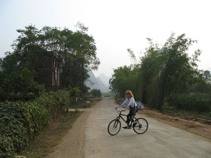 | We found the Bamboo House and it was nice, so we took a room. They had bikes for rent so we got a couple. Yangshuo isn't very big, so it didn't take long before we were out in the country. It was quite a welcome change from the hyperurban Hong Kong and Shenzhen environments. We rode for hours past lush green fields, tiny villages, stone huts and water buffalo. | Biking through the countryside |