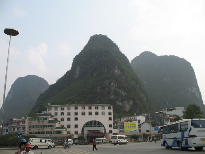 | When I woke up again, I could already those strange Dr. Seuss mountains that I had seen on the walls of so many Chinese restaurants in the United States. I read somewhere that they are called Karsts. They are peculiar indeed. As soon as we got off the bus in Yangshuo, we were approached by several people with hotel rooms they wanted us to see. We had a look at one that was quite nicely furnished but was right next door to a construction site. The book mentioned a hotel called the Bamboo House that was supposed to be quiet. | Extremely large lumps called karsts More Karsts! |