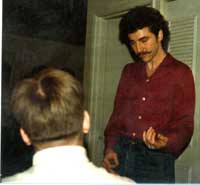 Luke showing Roy the chords to a Buzzcocks song on air guitar  |