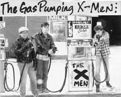 It all started when I walked into The Edge Gallery in Villa Park, a suburb of Chicago in 1983. I was looking for some place to show my paintings. There was a young man laboring over a very strange painting of his own inside. His name was Bill Harnden. We started talking. He told me he was in a band called the X-Men, a punk rock band of sorts. They were comprised of a drummer and two guitarists who switched off playing bass. They were interested in finding a full-time bass player. Well, it just so happened that I had played bass in a band the year before that broke up when we all graduated from college and went our separate ways, so I said I would play bass in their band. We practiced once before we played at a Xmas party in the basement of Bill's parent's house. There was a keg and about twelve people standing around. Things were going fine until we played Salami Torpedo, a song we came up with at the Wag's Restaurant just before the party. It went, "Met a girl and I thought she was neat-o, Stole her from a guy named Guido, Took her out to have a burrito, Then I showed her my Salami Torpedo." Everybody left in a hurry. Our first real gig was opening for The Bonemen of Barumba (you remember them, right?). It was at this bizarre place called Mr. C's Across the Street, on the far west side on Chicago Ave. several blocks east of Austin Ave. It was an out-of business disco with all the trimmings - mirror balls, velvet couches, wading pools. Most impressive was the huge fluorescent blue swordfish on the wall of the "dressing room." There was a rib joint downstairs and we all had ribs and Champale (you remember Champale, right?) for dinner. People kept diving on the stage and into the drum set while we played. This was a bad thing because there was at least a six foot drop to the floor behind the drum riser. Mark Mosher (the other guitarist) was trying to tune up his guitar and Bill wouldn't cooperate, soon there was a shoving match that became a fist fight. There was something about tuning that always made Bill really angry. I just remember looking over at Dan Thompson, the drummer, and shaking my head. As soon as we finished playing Mark, who was very drunk, sat down and his head immediately fell back - passed out cold. The only thing I remember about the Bonemen of Barumba was their bass player, Marty, who at one point looked disoriented and grabbed the stage curtain and fell off the front of the stage bringing the curtain down with him. The sound of his crashing on the floor with his bass was really cool. When it was time to leave, there were two friends of ours who needed a ride home. The whole back of the El Camino pickup we came in was filled with equipment so we had to fit five people in the front seat. It took a major feat of contortion and we had just pulled the door shut when the law showed up. I was apprehensive. It was four in the morning, we were all blasted and I was only one who was of legal drinking age, Mark, who was 17, who had only recently regained consciousness, was sitting in the driver's seat with his huge red mohawk, we had a truckload of music equipment and two fifteen year old girls as passengers, and a seating arrangement that looked like a circus act. Plus, Chicago cops automatically assume that if your a white kid in a totally black neighborhood you must be buying drugs. The cops asked, "What are you doing around here?" over their PA speaker. For some reason, I opened the car door, I guess I figured we were all going to jail so we might as well get it over with. When I got the door open the girl on my lap fell out onto the ground. There was much giggling. We told them we'd just played a show. They just said, "OK, get going." Shortly